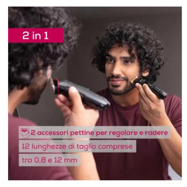 Regolabarba MN4XModellare la barba in tutta semplicità! Con il regolabarba MN4X di Beurer puoi regolare e radere la barba in base alle tue esigenze con estrema semplicità. Grazie a 10 lunghezze di taglio e alla regolazione fine a 2 livelli, tutti possono trovare la lunghezza adatta. Inoltre, puoi lavare facilmente il dispositivo e la testina per un utilizzo igienico.Lama per rasatura autoaffilante in acciaio inossidabile con rivestimento in titanio per il massimo comfort sulla pellePotente batteria ricaricabile al litio per 90min. di autonomia; tempo di ricarica di 90 minPossibilità di rasatura sia con funzionamento a batteria sia con alimentazione da rete elettricaIl dispositivo è lavabileSet da taglio rimovibile per una pulizia igienica sotto acqua correnteBarba curata e contorni precisi grazie a diverse regolazioni della lunghezza2 accessori pettine a lunghezza regolabile con 10 lunghezze di taglio: 3-7/8-12mmRegolazione fine a 2 livelli: 0,8 e 1,2mmDisplay a LED con stato della batteria in % e indicatore di caricaLama per rasatura autoaffilante in acciaio inossidabile con rivestimento in titanio per il massimo comfort sulla pelle e una barba curata