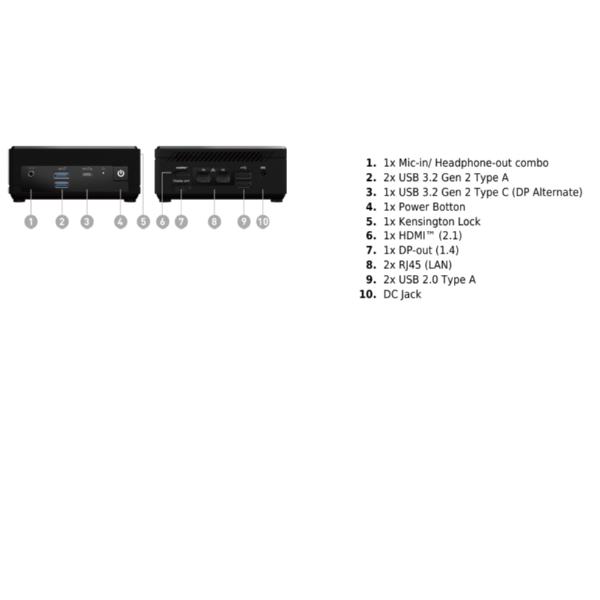 1x mic-in/ headphone-out combo2x usb 3.2 gen 2 type a1x usb 3.2 gen 2 type c (dp alternate)1x power botton1x kensington lock1x hdmi (2.1)1x dp-out (1.4)2x rj45 (lan)2x usb 2.0 type adc jack
