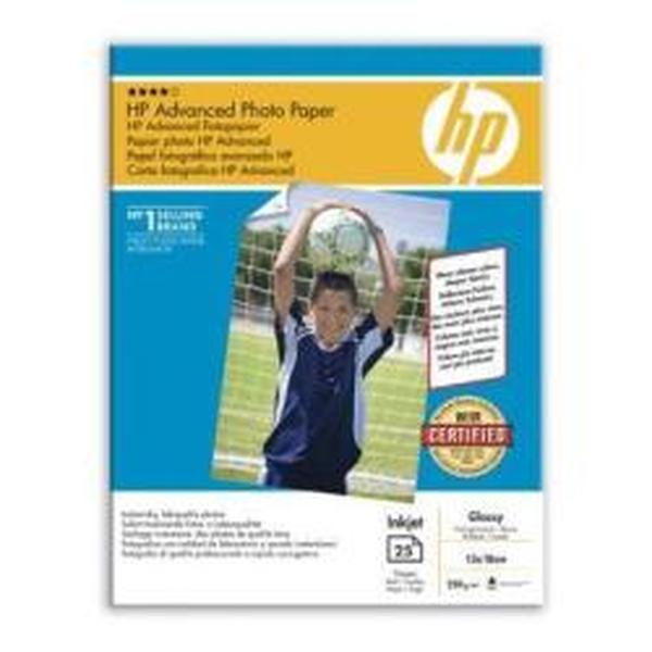 HP Carta fotografica Advanced, lucida, 250 g/m2, 13" x 18" (127 x 178 mm), 25 fogli. Tipo rifinitura: Lucida, Peso medio: 250 g/m², Tecnologia di stampa: Ad inchiostro. Larghezza: 149,2 mm, Profondità: 14,3 mm, Altezza: 193,7 mm. Quantità per pacco: 1 pz, Larghezza imballo: 195 mm, Profondità imballo: 150 mm. Peso del pallet: 92 g, Numero di cartoni per pallet: 26 pz, Numero di livelli per pallet: 1 pz. Dimensioni (LxPxA): 149 x 14,3 x 193 mm, Dimensioni (un foglio): 130 x 180 mm, Fogli per pacco: 25 fogli