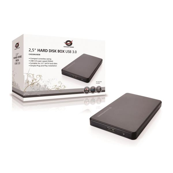 Conceptronic | CHD2MUSB3BBox per hard disk da 2,5" USB 3.0Con questo box USB 3.0 SuperSpeed per dischi rigidi da 2,5 è molto semplice collegare un disco rigido SATA da 2,5 (9,5 mm) ad una porta USB 3.0 del PC, notebook o netbook. Questo box per dischi rigidi è perfetto per trasferire file video di grandi dimensioni, eseguire backup o semplicemente da usare come secondo disco rigido grazie alla velocità massima dei dati di 5Gb/s*. Grazie al meccanismo scorrevole ad incastro lassemblaggio può essere eseguito in meno di 5 secondi! Ce sempre una tasca vuota in cui riporre questo box ultrapiatto e leggero per portarlo con se! Progettazione senza viti per un facile montaggioUSB 3.0 Super Speed