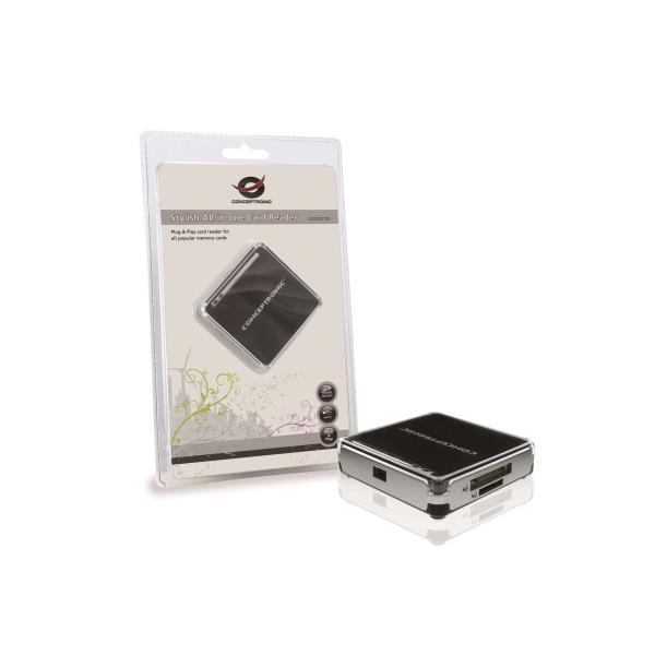 CONCEPTRONIC |CMULTIRWU2 Questo lettore di schede tutto in uno è un accessorio elegante e compatto per il computer. Questo lettore di schede compatto tutto in uno supporta le schede di memoria più comunemente usate da telefoni cellulari, fotocamere digitali e lettori MP3, più di 50 tipi diversi di schede di memoria*. Questo è un dispositivo USB 2.0 alimentato, non è necessaria alimentazione esterna. Il LED sulla parte superiore indica lo stato dell’alimentazione o del trasferimento dei dati. Compatibile con Compact Flash I / II, microSD / T-Flash, miniSD, SD, SDHC, miniSDHC, SDHC, Memory Stick, Memory Stick PRO, Memory Stick Duo, Memory Stick PRO Duo, Memory Stick Micro M2, MMC, MMCmobile, MMCplus e RS-MMC Design compattoPlug and play, nessun driver necessario Alimentato via USB