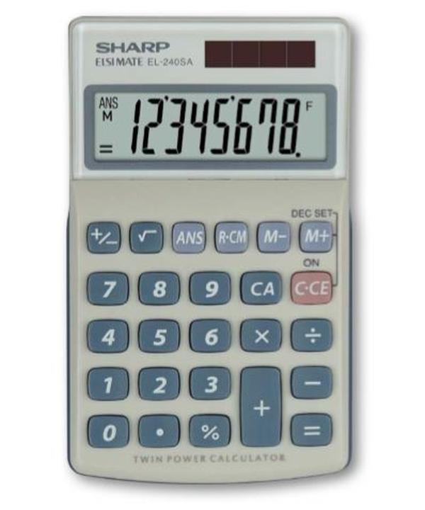 CALCOLATRICE tascabile EL 240 SA: FUNZIONE ► GRANDE DISPLAY INCLINATO A 8 CIFRE ► DOPPIA ALIMENTAZIONE (batteria e solare) ► SEPARATORE OGNI 3 CIFRE ► IMPOSTAZIONE DECIMALE (F-2-0) ► 3 TASTI MEMORIA ► CONTROLLA IL RISULTATO (ANS) ULTERIORI INFORMAZIONI ► Batteria (*Utilizzo di Back-up): *LR54 × 1 ► Dimensioni (mm): 116 × 71 × 17 ► Peso (g): 58