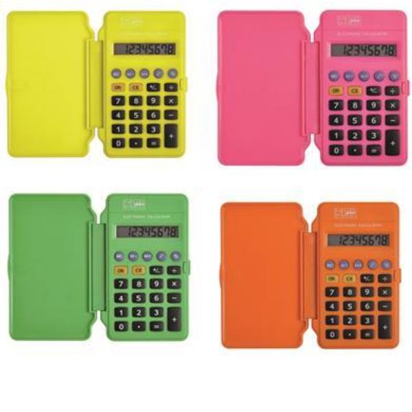 Calcolatrice tascabile 8 cifre tasti in plastica Coperchio protettivo dim.cm. 6 x 10 5 batteria inclusi. 4 COLORI ASS.TI
