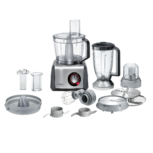 Bosch MC812M844 Robot da Cucina Multifunzione, 1250 W, AlluminioSmart tool detection: il robot imposta automaticamente la velocità corretta per ogni accessorio1250 watt per extra potenzaMultifunzione: fino a 50 funzioni diverse per miscelare, tristatre, impastare, grattuggiare, fare puree e molto altro ancora!Ciotola XXL da 3,9 L per fino a 1,5KG di impasto e bicchiere frullatore in Tritan di alta qualità da 1,5LMini-tritatutto per tritare piccole quantità di erbe, carne, formaggio, verdura, frutta etcVelocità variabile con impostazione pulse e moment. Indicatore di funzionamento con luce LED.Lama multifunzione WaveCut per tagli precisi e perfettiACCESSORI INCLUSI Ciotola in plastica trasparente da 3.9 l per 750 g di farina + ingredienti (mx 1.5 kg per un impasto duro) con coperchio con foro per introdurre gli alimenti.Bicchiere frullatore in plastica da 1.5 lSpremiagrumi per preparare gustose spremuteDisco reversibile per affettare (sottile o spesso) e disco reversibile per grattugiare (grosso o fine).Disco per patatine fritteDischi in acciaio inoxPorta disco per una maggiore stabilitàLama per impastareFrusta per montare e per impasti morbidiSICUREZZA Sicurezza: blocco coperchio ciotola e frullatore durante l'usoPiedini in gomma per una maggiore stabilità durante l'uso