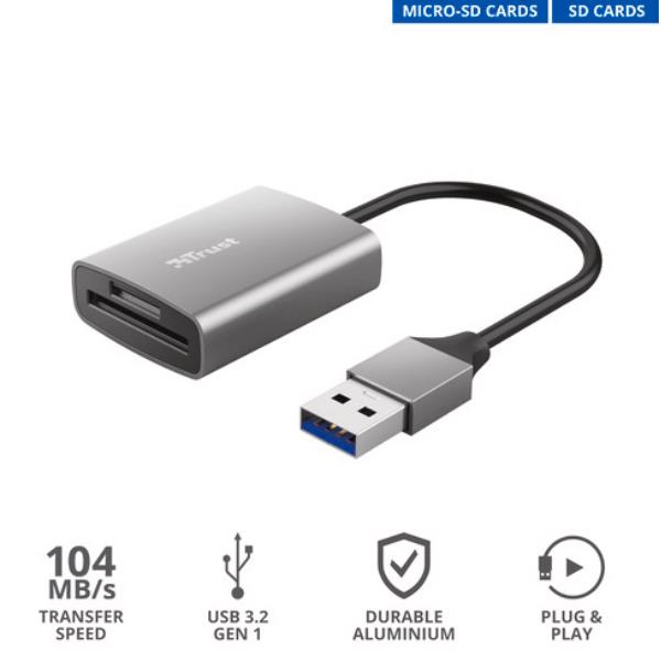 Un compagno di viaggio compattoSe sei un fotografo o un cameraman sempre in giro alla ricerca dello scatto o del video perfetto, sicuramente non avrai voglia di trascinarti dietro attrezzature pesanti. Il lettore di schede Trust Dalyx Fast USB 3.0 è la soluzione perfetta per il backup delle immagini quando sei in viaggio.RapidoIl lettore di schede Dalyx offre la rapida connessione USB 3.2 (Gen 1) di tipo A, per salvare rapidamente il tuo lavoro e continuare a riprendere. Grazie alle schede compatibili UHS-I, puoi copiare i dati a una velocità massima di trasferimento di 104MB/s. Salva il tuo duro lavoro e continua a fare quello che ami di più: catturare immagini incredibili.Piccolo e potentePuoi portare sempre con te il lettore di schede Trust Dalyx. È talmente piccolo che in borsa non lo noterai neanche, e l'alloggiamento in alluminio pressofuso protegge il lettore di schede dai pericoli del mondo esterno. Viene fornito con un cavo USB corto per avere la borsa o la scrivania sempre in ordine, e visto che è compatibile sia con le schede SD che con le micro SD, il lettore di schede Trust Dalyx è l'accessorio perfetto per qualsiasi fotografo, documentarista o appassionato di sport estremi.Funzionalità PrincipaliRapidoIl lettore di schede Dalyx offre la rapida connessione USB 3.2 (Gen 1) di tipo A, per salvare rapidamente il tuo lavoro e continuare a riprendere. Grazie alle schede compatibili UHS-I, puoi copiare i dati a una velocità massima di trasferimento di 104MB/s. Salva il tuo duro lavoro e continua a fare quello che ami di più: catturare immagini incredibili.PiccoloepotentePuoi portare sempre con te il lettore di schede Trust Dalyx. È talmente piccolo che in borsa non lo noterai neanche, e l'alloggiamento in alluminio pressofuso protegge il lettore di schede dai pericoli del mondo esterno. Viene fornito con un cavo USB corto per avere la borsa o la scrivania sempre in ordine, e visto che è compatibile sia con le schede SD che con le micro SD, il lettore di schede Trust Dalyx è l'accessorio perfetto per qualsiasi fotografo, documentarista o appassionato di sport estremi.