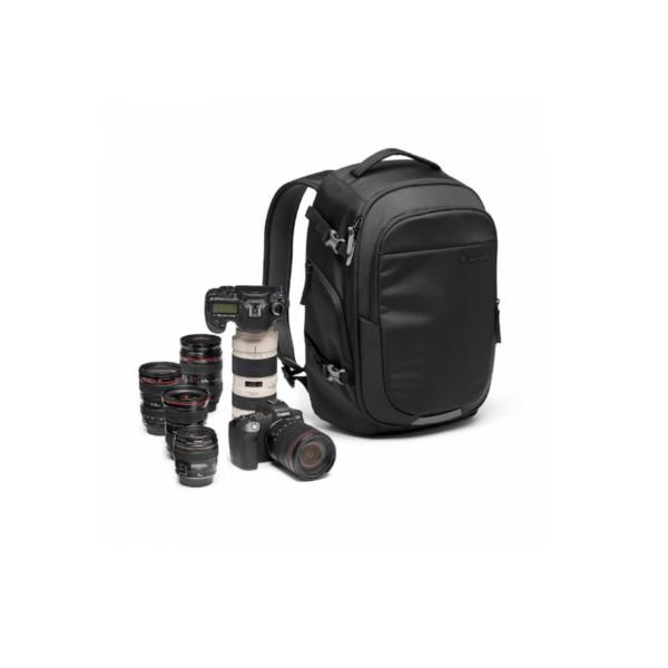 Zaino per fotocamera e laptop compatto e funzionale interamente dedicato all’attrezzatura fotografica. Lo Zaino Manfrotto Advanced Gear M III per reflex e CSC è uno zaino innovativo provvisto di spazio sufficiente per fotocamera e laptop, e al tempo stesso leggero, compatto e facile da trasportare. Trasporta in sicurezza una reflex con obiettivo 70-200/2.8 montato, così come 4 obiettivi supplementari, oppure una fotocamera mirrorless full frame con obiettivo 70-200/4 montato più 2-3 obiettivi supplementari e un kit DJI Mavic Air 2. Presenta una tasca imbottita per laptop da 15 pollici, facile da raggiungere quando in movimento.Lo scomparto imbottito per fotocamera presenta il nuovo Sistema di Protezione M-Guard™ Manfrotto. Realizzato in schiuma EVA ad alta densità, fornisce un eccezionale assorbimento degli urti con una sagoma sottile. La forma pieghevole personalizzabile consente massima versatilità per proteggere completamente l’attrezzatura fotografica, massimizzando al tempo stesso l’uso dello spazio.Puoi facilmente aprire completamente gli scomparti anteriori con cerniera per accedere rapidamente a ciò di cui hai bisogno. Tramite la cinghia sul lato puoi agganciare un treppiede da viaggio. Grazie a dimensioni, robustezza e versatilità e grazie alle ampie tasche, puoi organizzare facilmente tutta la tua attrezzatura. In aggiunta, la borsa presenta un’ulteriore tasca frontale per organizzare effetti personali e piccoli accessori.Tutti i tessuti esterni sono idrorepellenti e possono essere rinforzati dalla copertura antipioggia in caso di condizioni atmosferiche avverse.