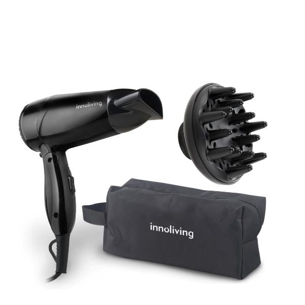 ASCIUGACAPELLI TRAVEL• Potenza 1600W• 2 impostazioni velocità e calore• Tasto aria fredda• Manico Pieghevole• Anello per appendere• Alimentazione: 220-240V ~ 50-60Hz• Accessori Inclusi: 1 diffusore, 1 custodia